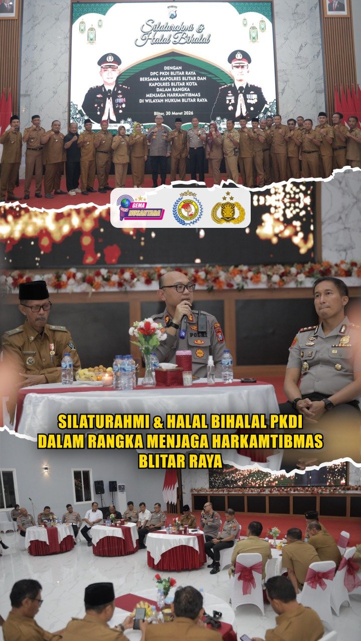 Blitar – Kapolres Blitar AKBP Rivanda, S.I.K., dan Kapolres Blitar Kota AKBP Kalfaris Triwijaya Lalo, S.I.K., M.I.K., pimpin langsung kegiatan halal bihalal bersama Persaudaraan Kepala Desa Indonesia (PKDI) Kabupaten Blitar Raya, Senin (30/3/2026). Berlangsung di Aula Tantya Sudhirajat Gabungan Polres Blitar & Polres Blitar Kota serta dihadiri para pejabat utama Polres.