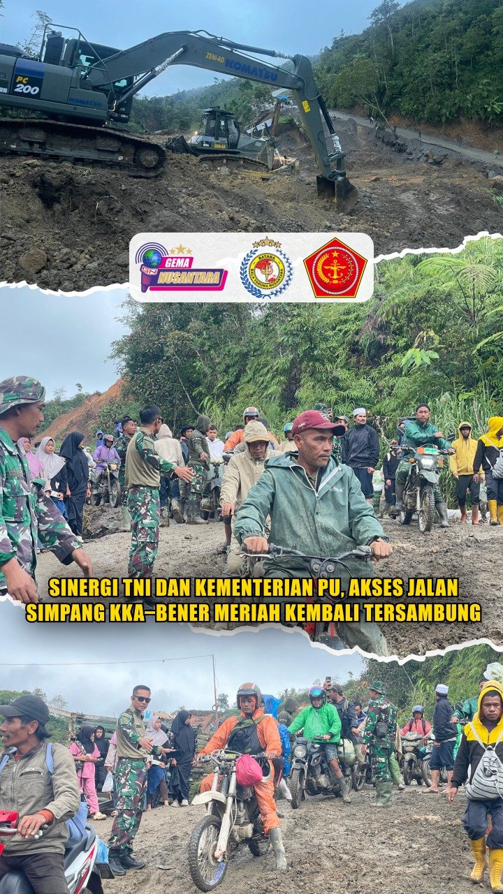 (Puspen TNI). Akses jalan Simpang KKA yang menghubungkan Kabupaten Aceh Utara dengan Kabupaten Bener Meriah kembali tersambung, Rabu (17/12/2025). Pemulihan akses tersebut merupakan hasil sinergi prajurit Yonzipur 16/Dhika Anoraga, Zidam Iskandar Muda, dan Kementerian Pekerjaan Umum (PU).