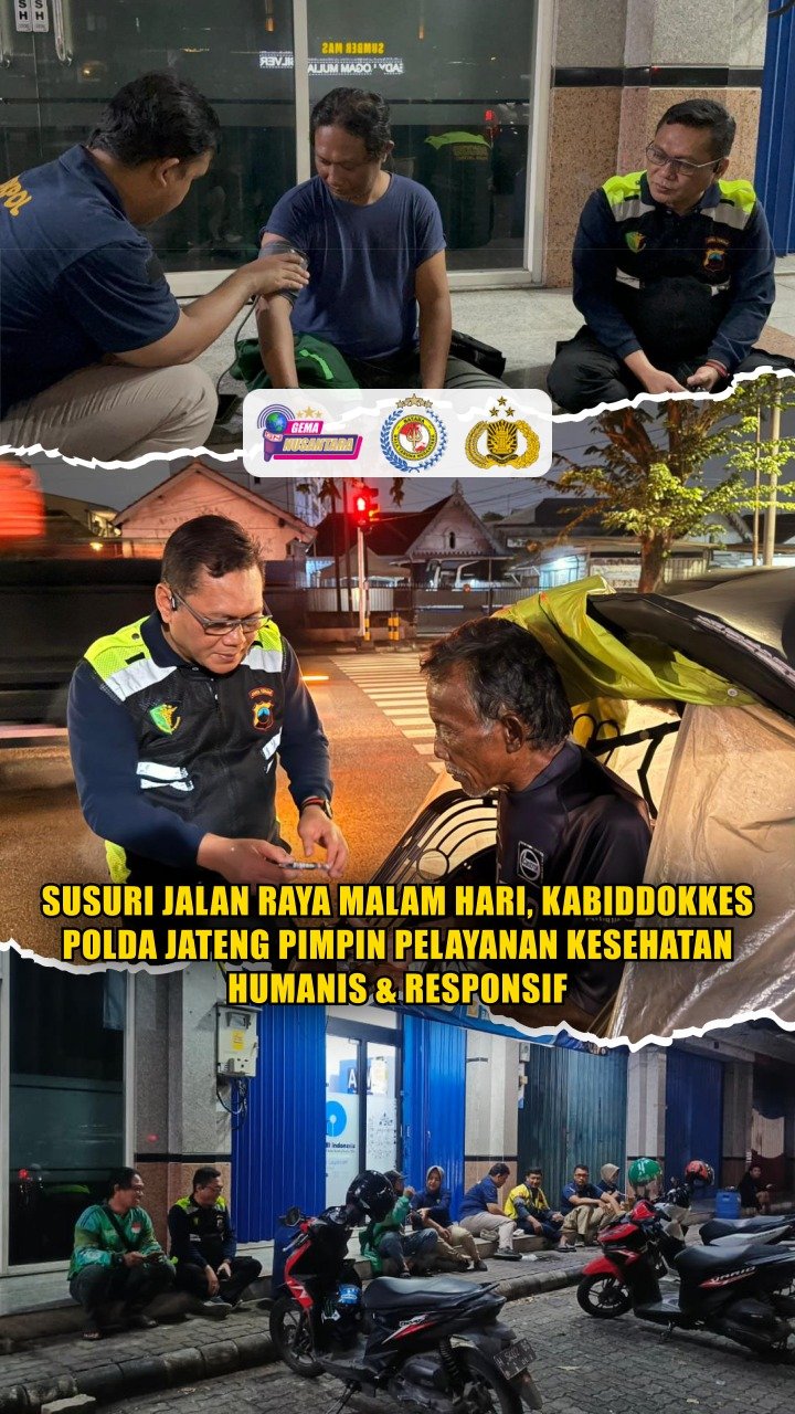 (PID Biddokkes Polda Jateng) – Menyusuri jalan raya di malam hari, Kabiddokkes Polda Jawa Tengah Kombes Pol drg. Agung Hadi W., Sp.BM., M.A.R.S., M.H., FISQua. memimpin langsung kegiatan pelayanan kesehatan (yankes) bagi para pekerja jalanan dan masyarakat yang masih beraktivitas.