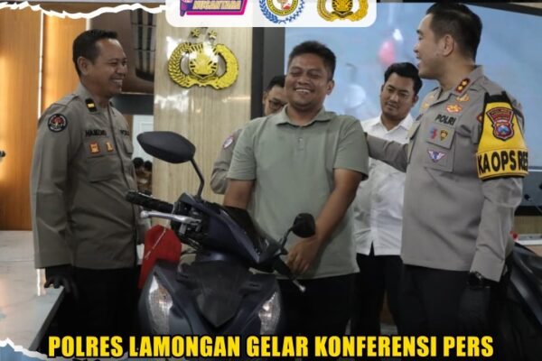 Lamongan – Kapolres Lamongan AKBP Arif Fazlurrahman, S.H., S.I.K., M.Si., didampingi Wakapolres Lamongan Kompol Jodi Indrawan, S.I.K., Kasat Reskrim, Kanit Pidum I Satreskrim, dan Kasihumas menggelar konferensi pers pengungkapan kasus tindak pidana pencurian dengan pemberatan (curanmor R-2) sebagaimana dimaksud dalam Pasal 477 KUHP yang terjadi di wilayah Kabupaten Lamongan. Berlangsung di Ruang Rupatama Tathya Dharaka…