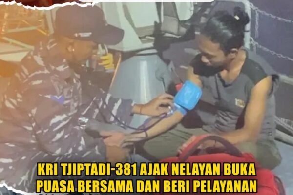 (Puspen TNI) – Prajurit TNI AL menggelar kegiatan buka puasa bersama para nelayan di geladak KRI Tjiptadi-381, berlokasi di wilayah perairan daerah operasi, Laut Jawa, Minggu (1/3/2026). Komandan KRI Tjiptadi-381 Letkol Laut (P) Fajar Adha menyampaikan bahwa prajurit membagikan makanan berbuka puasa yang dimasak langsung oleh juru masak kapal perang. KRI Tjiptadi-381 juga memberikan layanan…