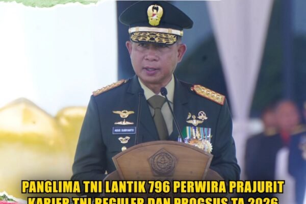 (Puspen TNI). Panglima TNI Jenderal TNI Agus Subiyanto, S.E., M.Si., melantik dan mengambil sumpah 796 Perwira Prajurit Karier (Pa PK) TNI Reguler dan Program Khusus (Progsus) Tahun Anggaran 2026 dalam upacara Prasetya Perwira yang dihadiri Wakil Panglima TNI Jenderal TNI Tandyo Budi Revita, S.Sos., Kasad, Kasal, Kasau serta Dankodiklat TNI, bertempat di Lapangan Prima Mabes…