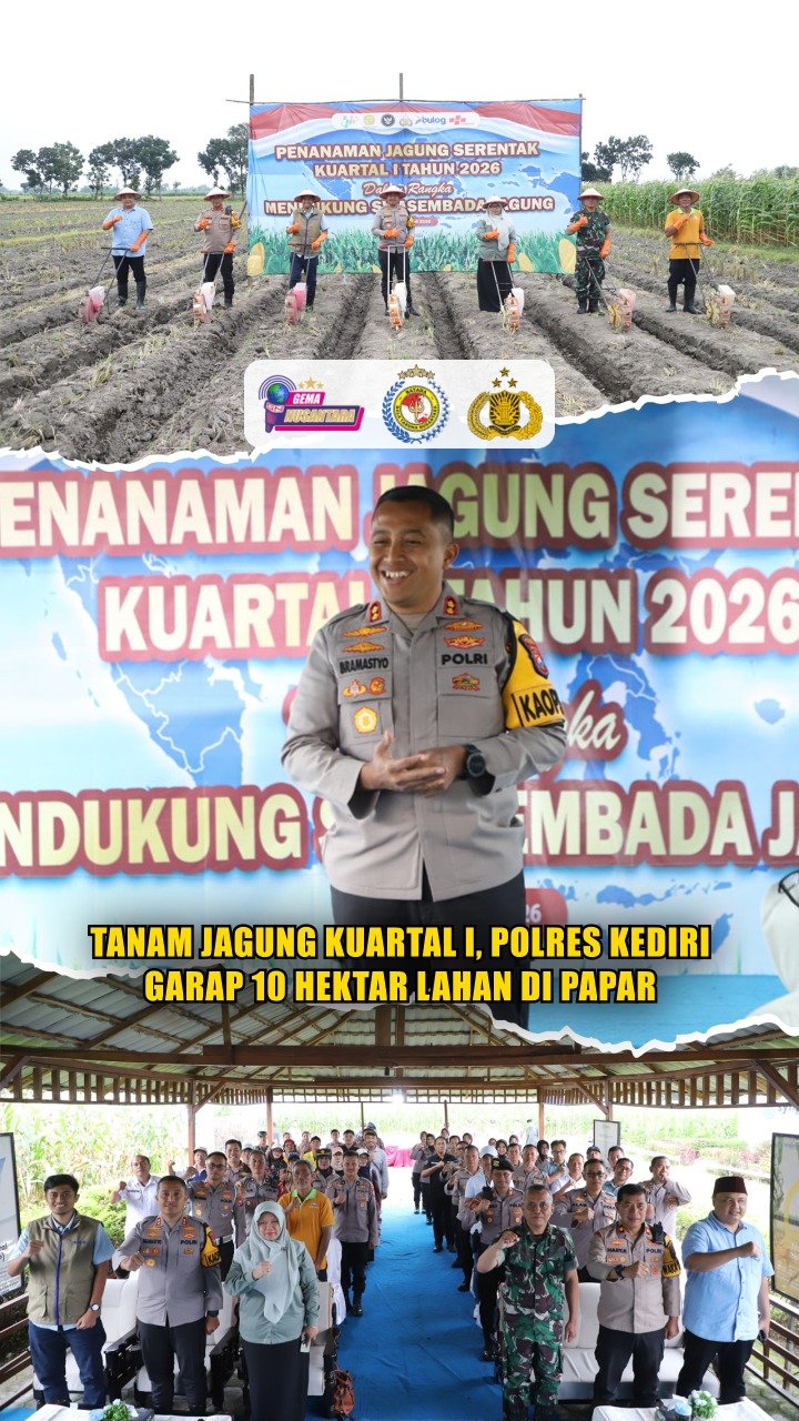 KEDIRI – Dalam rangka mendukung swasembada pangan nasional, Polres Kediri melaksanakan kegiatan Tanam Raya Jagung Serentak Kuartal I Tahun 2026 dengan lahan seluas 10 hektar di Desa Kedungmalang, Kecamatan Papar, Kabupaten Kediri pada Sabtu (7/3/2026).