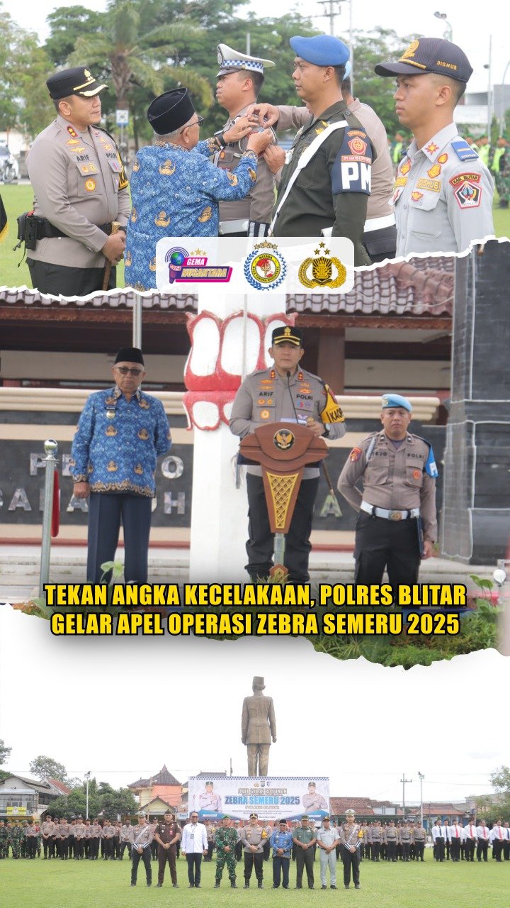 Blitar – Polres Blitar menggelar Apel Gelar Pasukan Operasi Zebra Semeru 2025 mulai 17 – 30 November 2025). Apel ini melibatkan 64 Personel Polres Blitar, TNI, Pemerintah Daerah, serta berbagai stakeholder sebagai bentuk sinergi menjaga keamanan dan ketertiban lalu lintas di Kabupaten Blitar, Senin (17/11/2025).