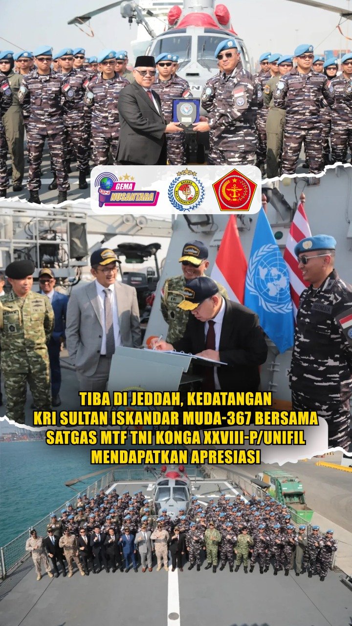 Puspen TNI – Duta Besar Luar Biasa dan Berkuasa Penuh (LBBP) Republik Indonesia untuk Kerajaan Arab Saudi, Dr. Abdul Aziz Ahmad, menyambut langsung kedatangan KRI Sultan Iskandar Muda-367 (KRI SIM-367) yang membawa prajurit Satgas MTF TNI Konga XXVIII-P/UNIFIL di Jeddah Islamic Port, Arab Saudi, Jumat (09/01/2026). Turut hadir sejumlah pejabat perwakilan Republik Indonesia dan mitra strategis setempat di antaranya HOC KJRI Jeddah Yusron B. Ambary, Atase Pertahanan RI di Riyadh – Brigjen TNI Eri Nasuhi,dll.