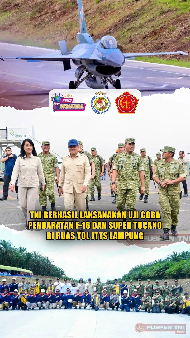 (Pusspen TNI). TNI berhasil melaksanakan uji coba pendaratan pesawat tempur TNI AU jenis F-16 dan Super Tucano di Ruas Tol Terbanggi Besar–Pematang Panggang–Kayu Agung (JTTS), Provinsi Lampung, Rabu (11/2/2026).