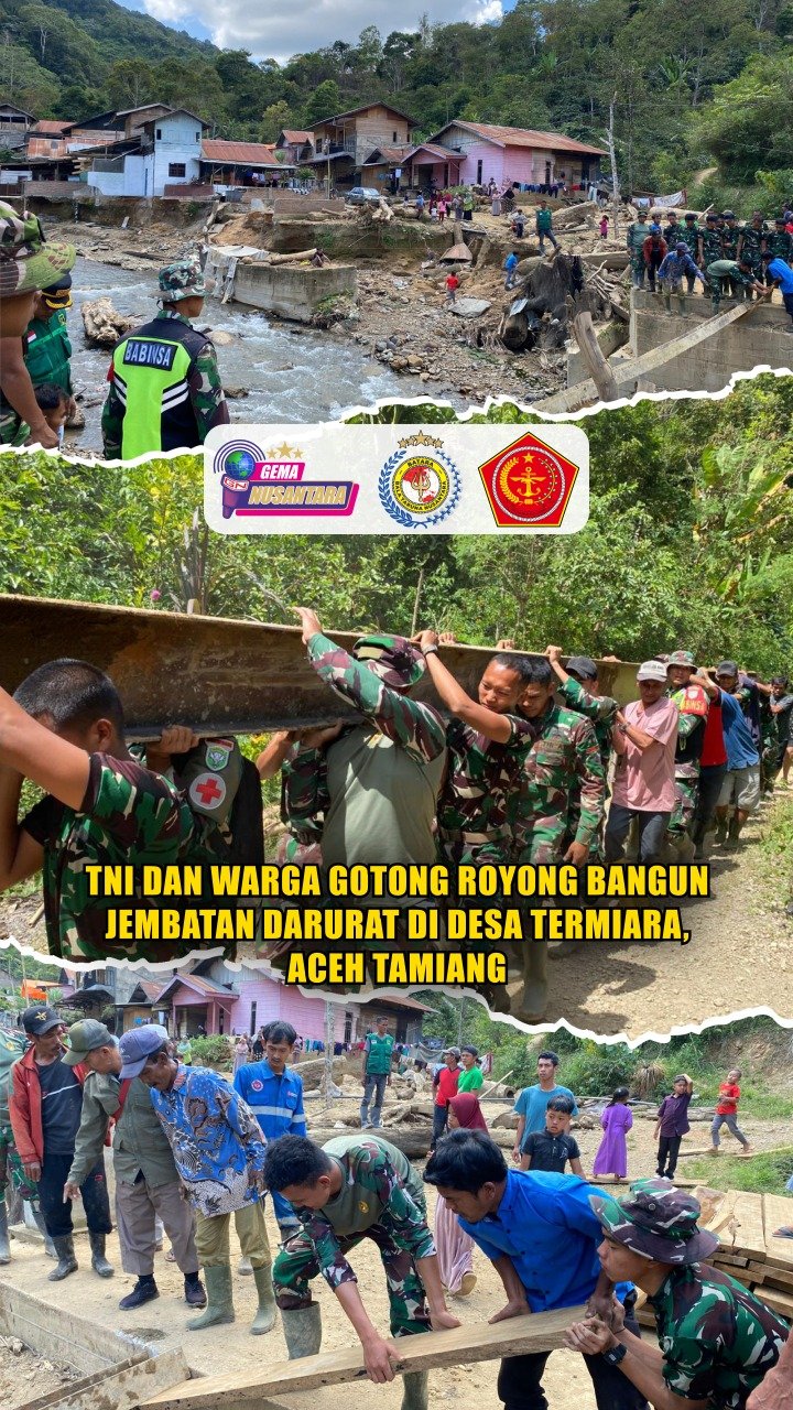 Pendam IM — Anggota Koramil 08/Silih Nara, Kodim 0106/Aceh Tengah, bersama personel Yonif TP 854/Dharma Kersaka, serta masyarakat Desa Termiara, Kecamatan Rusip Antara, Kabupaten Aceh Tengah, melaksanakan kegiatan gotong royong pembangunan jembatan darurat. Minggu (1/2/26).