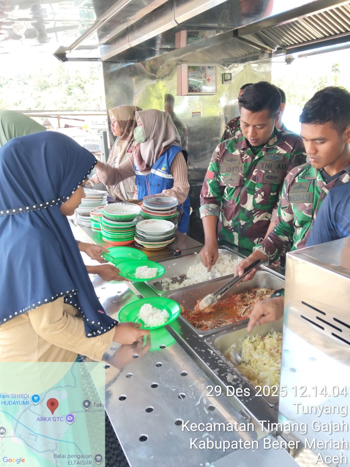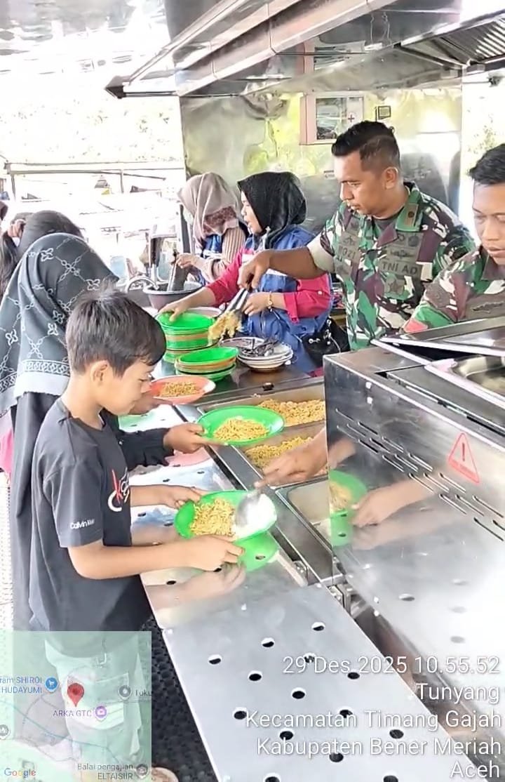 (Puspen TNI). TNI melalui Bekangdam Iskandar Muda mendirikan dapur umum di Kecamatan Timang Gajah, Kabupaten Bener Meriah, guna membantu memenuhi kebutuhan konsumsi masyarakat terdampak bencana di wilayah Pantan Kemuning dan Desa Tunyang, Senin (29/12/2025).