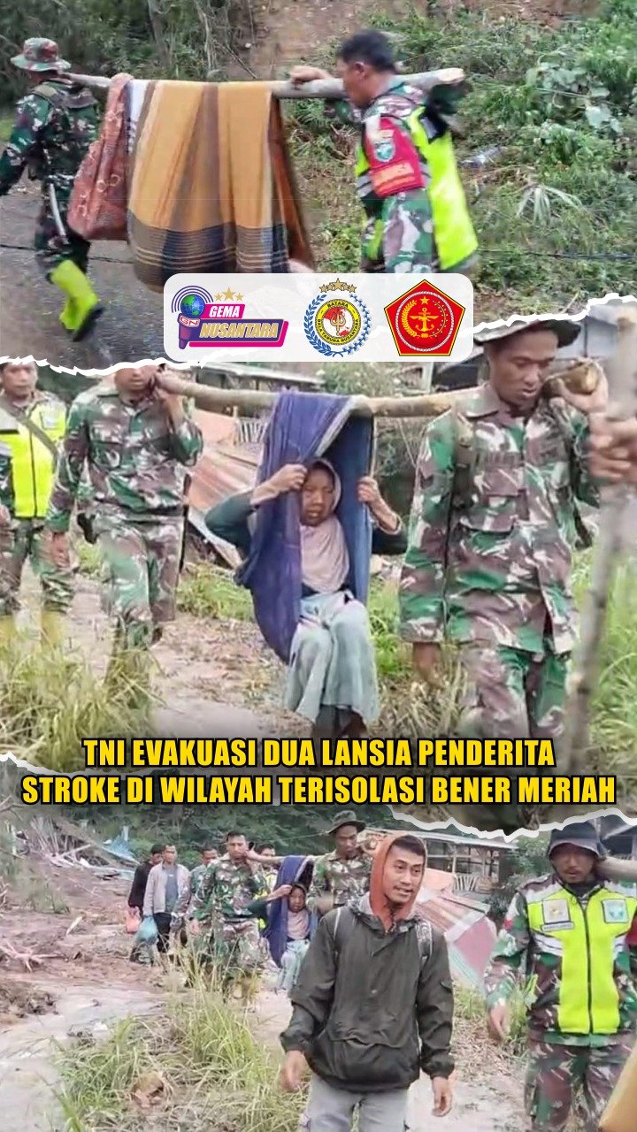 (Puspen TNI). TNI mengerahkan Babinsa Koramil 0119/Bener Meriah, Kodam Iskandar Muda, untuk mengevakuasi dua warga lanjut usia penderita stroke dari Dusun Guci, Desa Burni Pase, Kecamatan Permata, Kabupaten Bener Meriah, Kamis (11/12/2025).