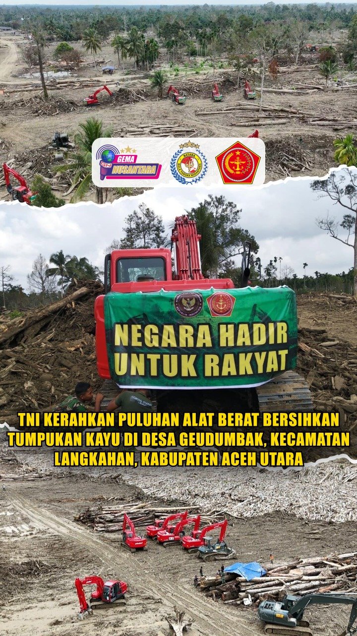 TNI Kerahkan Puluhan Alat berat bersihkan tumpukan kayu di Desa Geudumbak, Kecamatan Langkahan, Kabupaten Aceh Utara