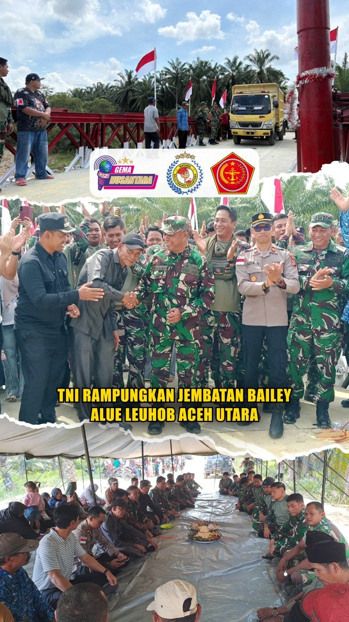 Pendam IM – Prajurit TNI dari Yonzipur 4/Tanpa Kawandya bersama personel Kodim 0103/Aceh Utara berhasil merampungkan pembangunan Jembatan Bailey yang berlokasi di Desa Alue Leuhob, Kecamatan Cot Girek, Kabupaten Aceh Utara, Sabtu (14/2/2026). Memiliki tipe 2-1 dan menghubungkan Kecamatan Baktiya, Langkahan, dan Cot Girek. Dukungan Material dari Kementerian Pertahanan Republik Indonesia.