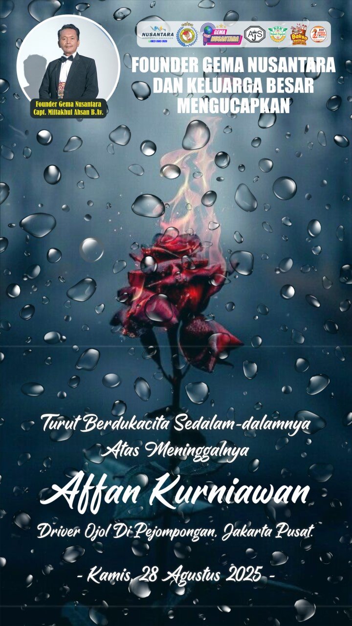 Founder Gema Nusantara Capt. Miftakhul Ahsan B.Av. Dan Keluarga Besar Mengucapkan Turut Berdukacita Sedalam-dalamnya Atas Meninggalnya Affan Kurniawan, Driver Ojol Di Pejompongan, Jakarta Pusat, Kamis, 28 Agustus 2025.