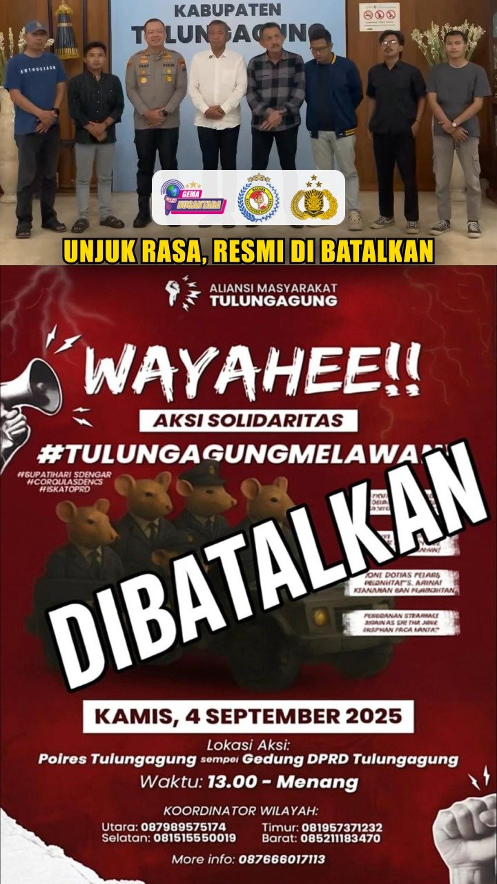 Tulungagung – Hasil pertemuan Bupati Tulungagung H. Gatut Sunu Wibowo, SE., ME., Ketua DPRD Kabupaten Tulungagung Marsono, S.Sos., dan Kapolres Tulungagung AKBP Muhammad Taat Resdi, S.H., S.I.K., MTCP., bersama para Korlap aksi, disepakati dengan mempertimbangkan situasi kamtibmas terkini, maka rencana unjuk rasa yang semula akan dilaksanakan Kamis, 4 September 2025 dinyatakan :