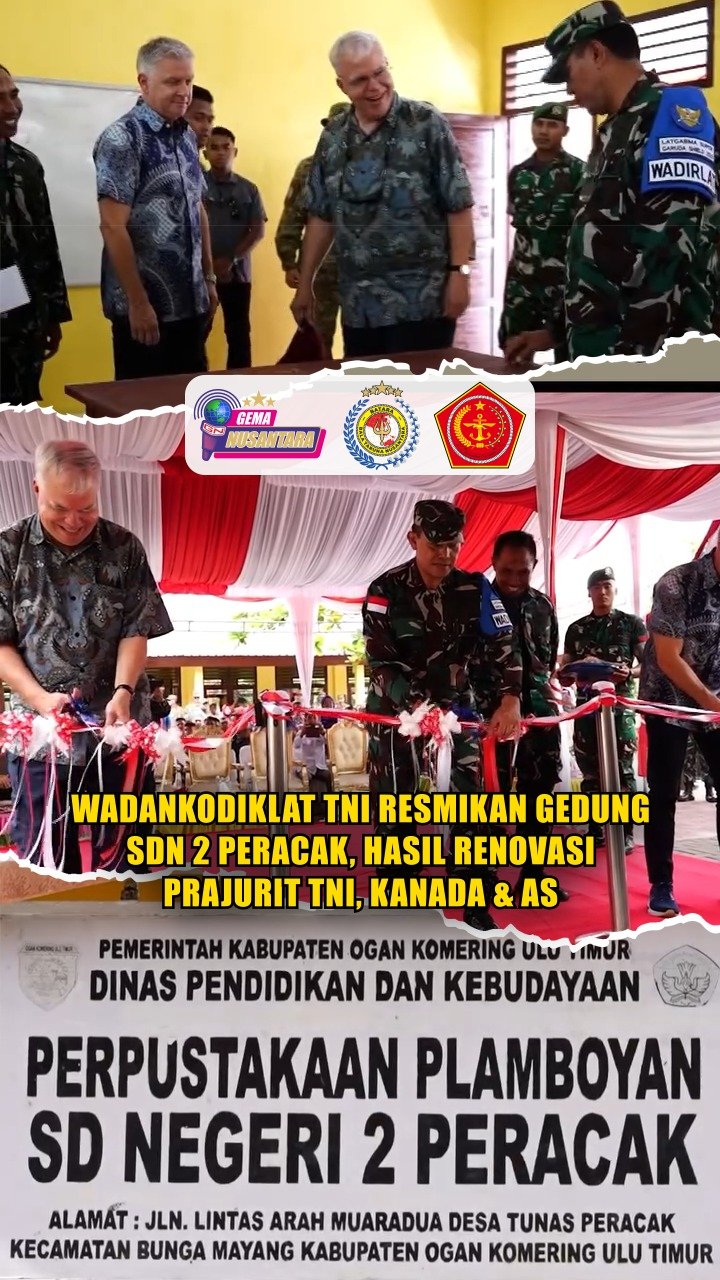 (Puspen TNI). Wadankodiklat TNI Marsda TNI Bambang Gunarto, S.T., M.M., M.Sc., mewakili Dankodiklat TNI meresmikan gedung SDN 2 Peracak di Kecamatan Bunga Mayang, Ogan Komering Ulu, Sumatera Selatan, yang telah selesai direnovasi oleh prajurit gabungan TNI bersama pasukan AS dan Kanada, Rabu (3/9/2025). Peresmian didampingi Dubes Kanada Jess Dutton dan KUAI AS untuk Indonesia Peter M. Haymond.