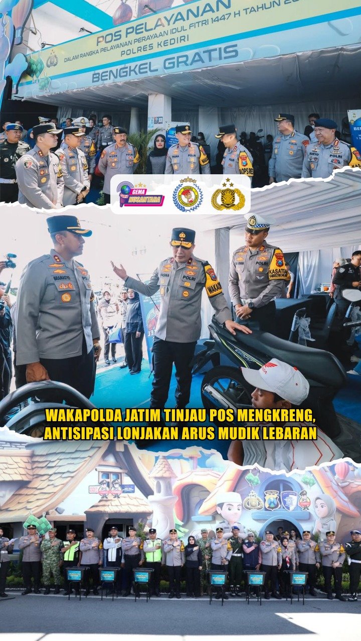 Wakapolda Jatim juga menyempatkan menyapa para pemudik serta menyerahkan bingkisan sebagai bentuk kepedulian kepada pengguna jalan. Kapolres Kediri AKBP Bramastyo Priaji, S.H., S.I.K., M.Si., menyampaikan bahwa selain peninjauan kesiapan personel, sinergi lintas wilayah antara Polres Kediri, Jombang, dan Nganjuk juga menjadi perhatian dalam mengantisipasi potensi kepadatan di kawasan Mengkreng.