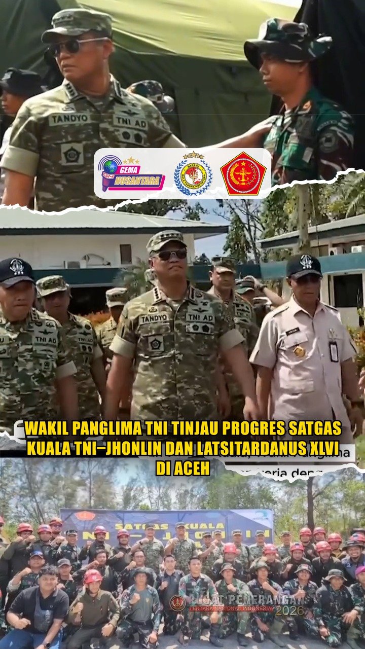 (Puspen TNI). Wapang TNI Jenderal TNI Tandyo Budi Revita, S.Sos., melaksanakan kunjungan kerja ke wilayah Kabupaten Aceh Tamiang, Provinsi Aceh, Rabu (28/1/2026). Diawali dengan meninjau progres kinerja Satgas Kuala TNI–Jhonlin TA 2026 di Muara Kuala Penaga Lama, Kecamatan Seruway. Dilanjutkan dengan meninjau Satgas penanggulangan bencana alam Sumatra sekaligus melihat secara langsung pelaksanaan Latsitardanus XLVI Tahun 2026, bertempat di Yonif 111/KB Manyak Payed, Kabupaten Aceh Tamiang.
